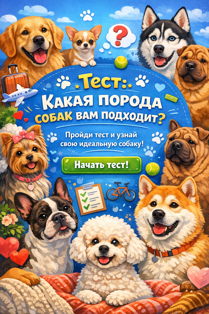 Выберите вариант ответа на каждый вопрос. В конце подсчитайте свои баллы и узнайте свою идеальную породу!