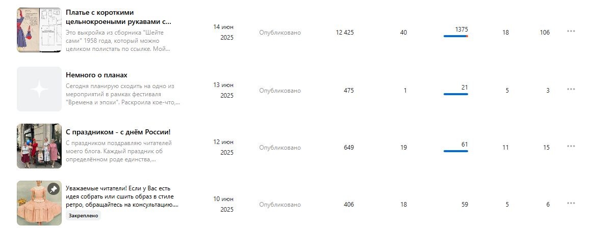 Решила просмотреть, какие статьи в моём блоге оказались наиболее популярными и успешными. Что читали больше всех из статей, написанных и опубликованных в 2025 году, хорошо рекомендовали алгоритмы, возможно, продолжают рекомендовать? Начнём с самых высоких цифр просмотров и показов. За год таких статей, которые набрали больше 1000 дочитываний, всего две. И это то, что больше всего любят читатели и продвигают алгоритмы на моём Дзене и в теме. Июньская статья о винтажной выкройке, в которой впечатления о самой выкройке, а также подборка фотографий, размышления о фасонах, набрала на данный момент 1375 дочитываний и просмотров и 12425 показов. Необычно, что набрала популярность не "традиционная" статья с подборкой выкроек или фасонов, а в ней я делюсь своим опытом и мыслями, обычно больше всех привлекают именно выкройки. На втором месте статья-подборка с винтажными чертежами выкроек фартуков. Традиционно то, что любят читатели. Январская статья набрала 1348 дочитываний и просмотров