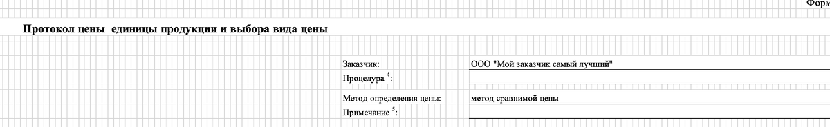 Как заполнить протокол цены: строки Заказчик и Метод определения цены