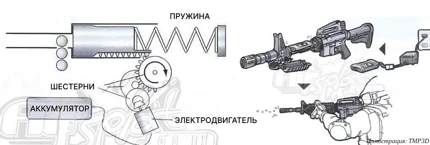 В последнее время технология 3D-печати методом селективного лазерного спекания (Selective Laser Sintering, SLS) нашла новое применение — производство высококачественных деталей страйкбольного оружия, открывающее новые возможности для энтузиастов оружейного спорта. Технология SLS 3D-печати хорошо известна способностью производить функциональные детали для множества отраслей — автомобилестроения, аэрокосмической промышленности, производства медицинского оборудования, бытовой электроники и других. SLS 3D-печать используется как в быстром прототипировании, так и мелко- и среднесерийном производстве функциональных изделий по индивидуальным заказам. К преимуществам SLS 3D-печати относятся высокая точность, механическая прочность и совместимость с широким спектром полимерных материалов. Страйкбольное оружие и спрос на качественную персонализацию Схема работы страйкбольного оружия с электроприводом Страйкбольное оружие стреляет нелетальными малоимпульсными боеприпасами — шариками — с помощью с
