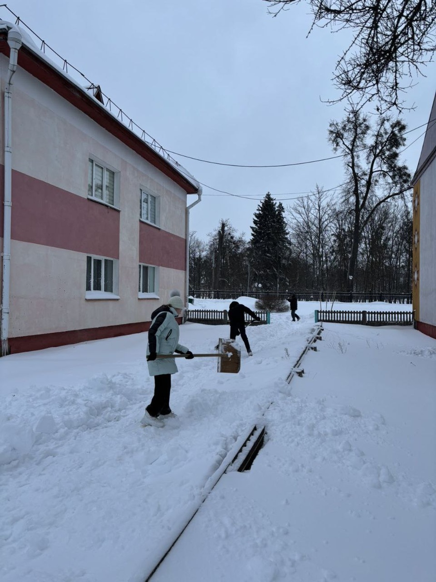 ФОТОФАКТ. Учащиеся СШ № 2 им. И.М. Шаврея помогают в расчистке дворов по ул. Макаренко