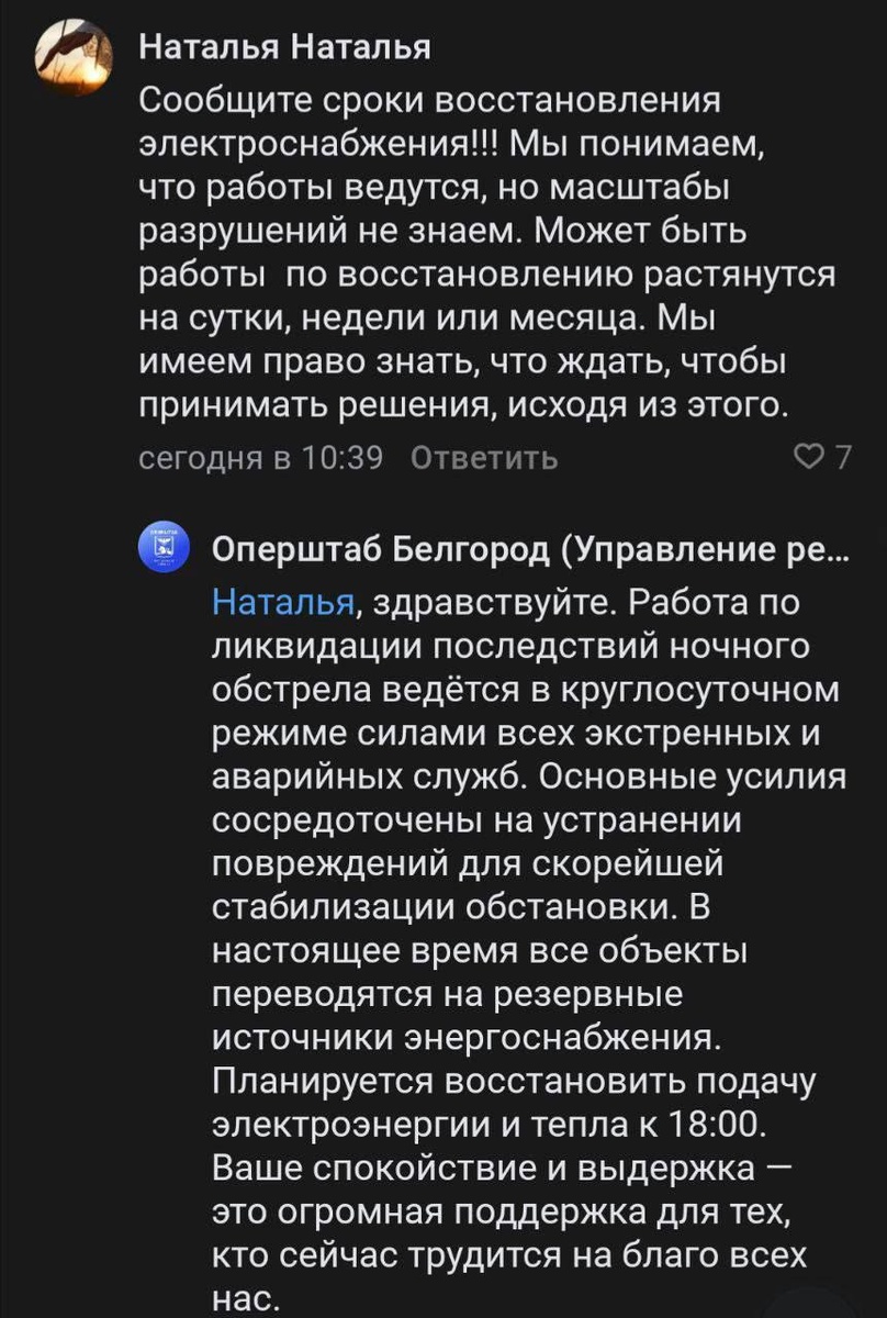 ⚡️Белгородский оперштаб: электричество в дома может вернуться к 18:00 пятницы