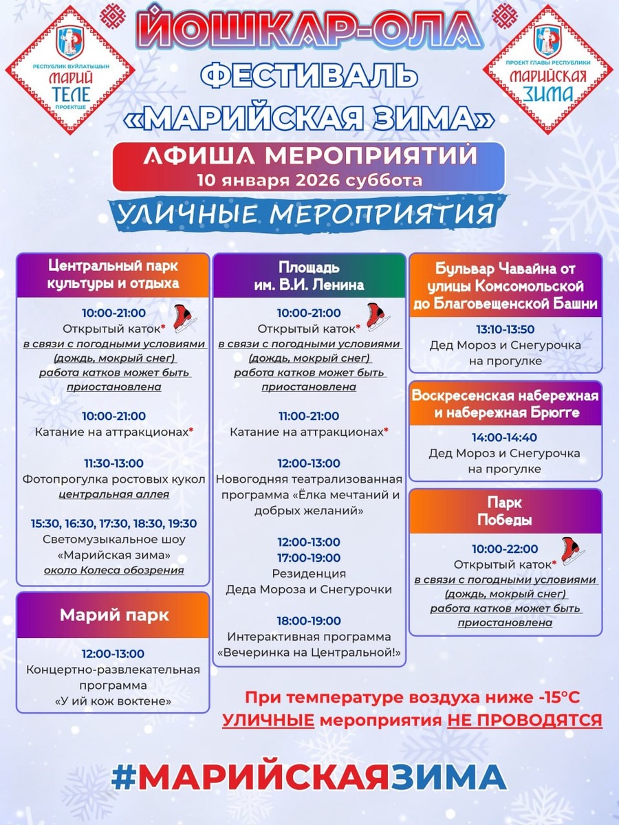 🎤 10 и 11 января посетителей ждут конкурс эстрадной песни, мастер-класс по прикладному искусству, ⚽️ товарищеский матч по мини-футболу, 🎭театрализованная программа, а также ⛸ катания на коньках, 🎡светомузыкальное шоу, прогулки со сказочными персонажами. Фестиваль «Марийская зима» реализуется по инициативе Главы Марий Эл Юрия Зайцева и проходит уже в четвертый раз.