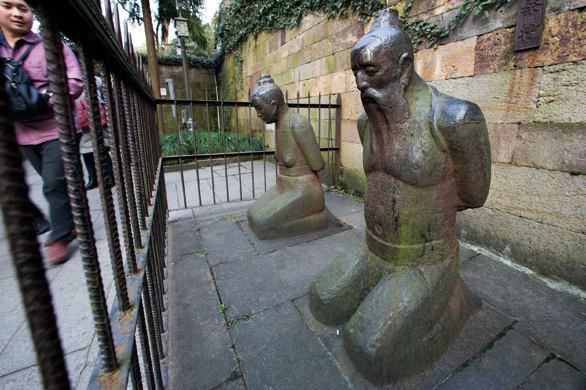 Есть в Китае уникальный памятник, поставленный в память политику-антигерою. К этому памятнику люди приходили выразить свое презрение этому деятелю: побраниться, плюнуть в него, а может помочиться и метнуть в него чем-то похуже. Цинь Хуэй (秦桧, 1091 - 1155), был главным министром при императоре Гаоцзуне. В этот период империя Сун активно воевала на севере с чжурчжэньской империей Цзинь. Будучи еще не топовым чиновником, во время боевых действий Цинь Хуэй был захвачен в плен войсками Цзинь. Через несколько лет плена, “чудесным образом” сбежав , Цинь Хуэй приехал в столицу империи Сун. Завоевав расположение императора Гаоцзуна, он быстро взбирался по карьерной лестнице, в конце концов став премьер-министром империи. При этом, конфликт с империей Цзинь не останавливался, на границе велись ожесточенные бои, где прославился генерал Юэ Фей. Благодаря своим победам, острому уму и отваг еон стал национальным героем. Но, премьер министр Цинь Хуэй придя к власти, стал активно продвигать позицию