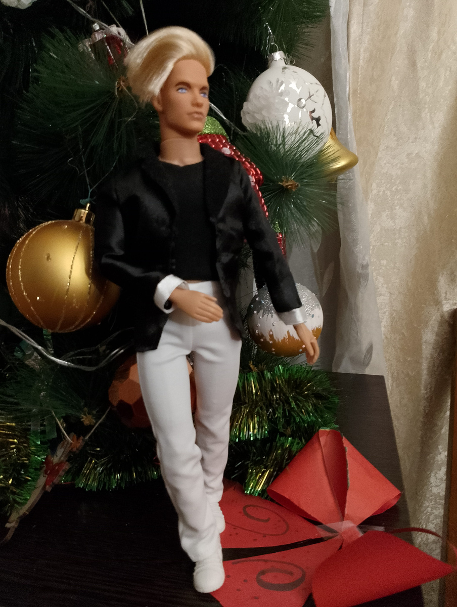 И вот он уже в другом наряде, хотя только сменил майку и пиджак на рубашку. В целом, кукла мне очень даже нравится. Правда, шарниры у него слабые. С ногами решила проблему тем,что накрутила ему на шарниры тонкие резинки. Руки вроде более-менее нормальные. Но нет шарниров в кистях.