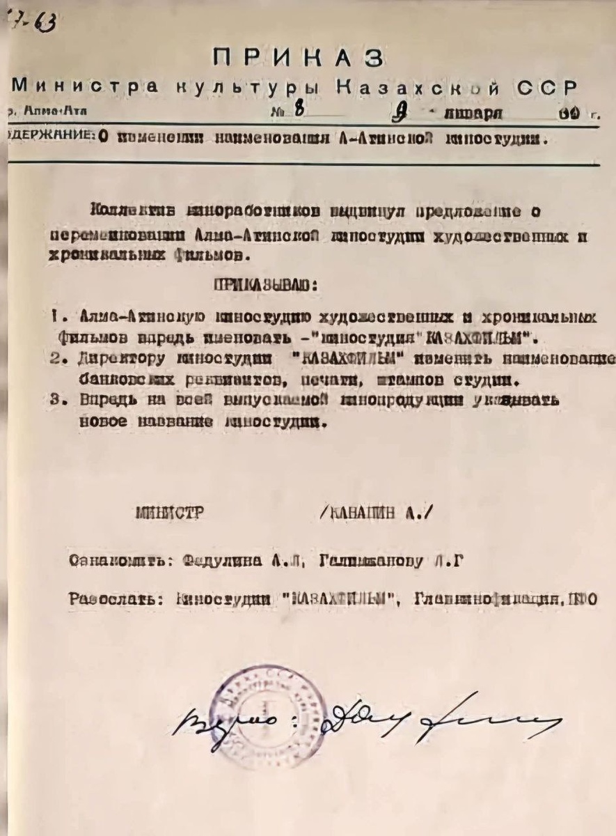 » 🎬 9 января 1960 года приказом Министерства культуры Казахской ССР Алматинская студия художественных и документальных фильмов была переименована в киностудию «Казахфильм». 🎞 С тех пор был пройден долгий путь, снято множество выдающихся фильмов, многие из которых стали классикой и по праву вошли в «золотой фонд» казахского кино. 🎉 Поздравляем всех кинематографистов Казахстана и сотрудников киностудии с этим замечательным юбилеем!