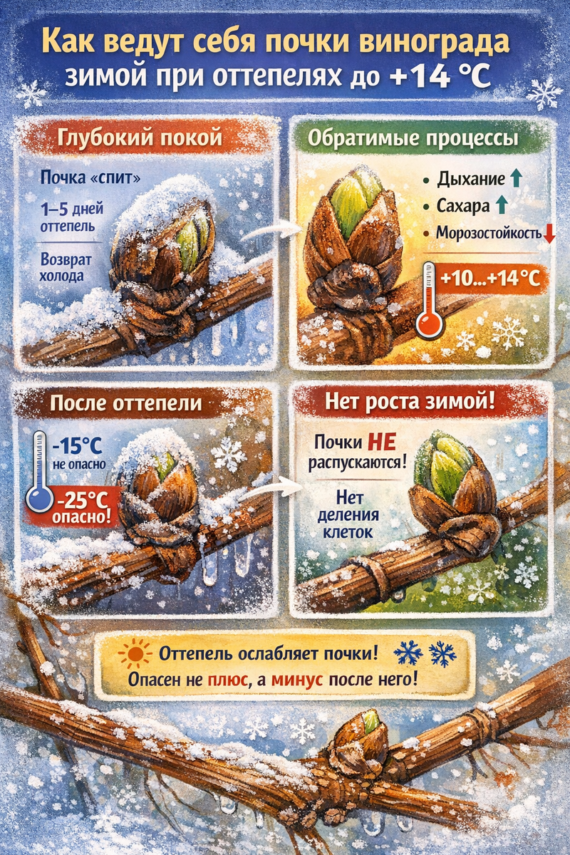 1. Состояние покоя (декабрь–февраль): 2. При оттепели от +8 до+14 С запускаются обратимые процессы: 3. Главный риск оттепелей: Пример: 👉Именно поэтому резкие качели температур опаснее стабильного холода. 4. Когда начинается реальная опасность: 5. Основная угроза — возвратные морозы после тёплых окон.