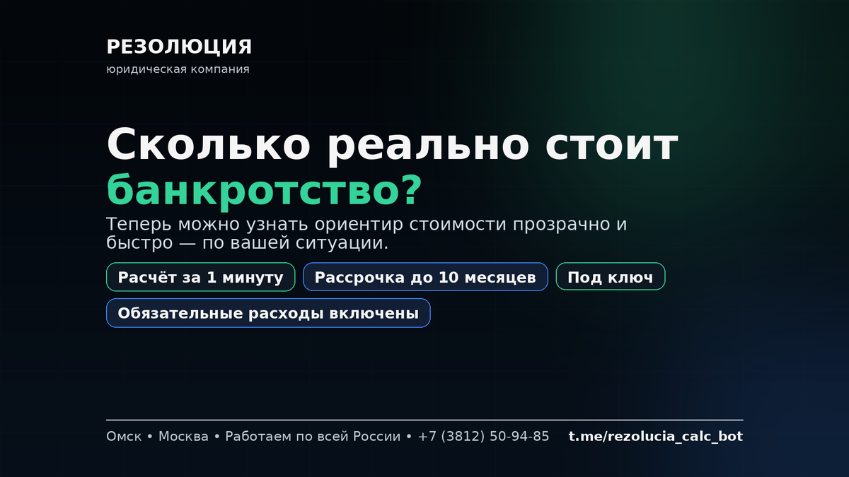 Это один из самых частых вопросов — и самый неудобный для клиента. Потому что на рынке часто встречается схема “цена от…”, а дальше начинаются уточнения, доплаты и непонятные условия. Мы в юридической компании «Резолюция» сделали проще: Стоимость всегда зависит от сложности. На сложность чаще всего влияют: Именно поэтому честная цена начинается не с “от…”, а с короткого уточнения вводных. Мы используем понятные уровни сложности (пакеты) — ориентир стоимости, которые фиксируются в договоре: Узнать стоимость банкротства в Вашей ситуации можно пройти в наш телеграмм-БОТ по ссылке: https://t.me/rezolucia_calc_bot Банкротство “под ключ” — это когда вы не собираете процесс по частям, а получаете сопровождение на всех этапах: Мы делаем “под ключ” в том числе по финансовой части: Мы сделали Telegram‑бот, который задаёт короткие вопросы по ключевым факторам (долг, имущество, сделки, ипотека и т.д.) и показывает ориентир стоимости и уровень сложности. Перейти