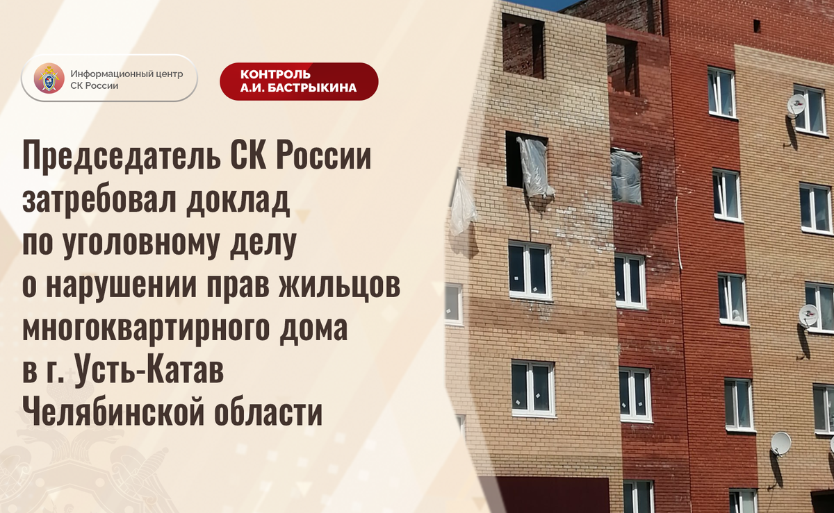 Председатель СК России затребовал доклад по уголовному делу о нарушении прав жильцов многоквартирного дома в г. Усть-Катав Челябинской области В социальной сети сообщается о нарушении прав жильцов многоквартирного дома в 1 микрорайоне города Усть-Катав Челябинской области. Часть здания до настоящего времени не достроена, застройщиком начата процедура банкротства. Из-за ненадлежащего состояния межквартирных перекрытий примыкающие к строению жилые помещения в период выпадения осадков затапливаются, внутренняя отделка повреждается. Обращения в компетентные органы результатов не принесли. В СУ СК России по Челябинской области возбуждено уголовное дело. Председатель Следственного комитета Российской Федерации Александр Иванович Бастрыкин затребовал у и.о. руководителя СУ СК России по Челябинской области Константина Владимировича Правосудова доклад о ходе и результатах расследования уголовного дела. Исполнение поручения поставлено на контроль в центральном аппарате ведомства. #СледственныйК