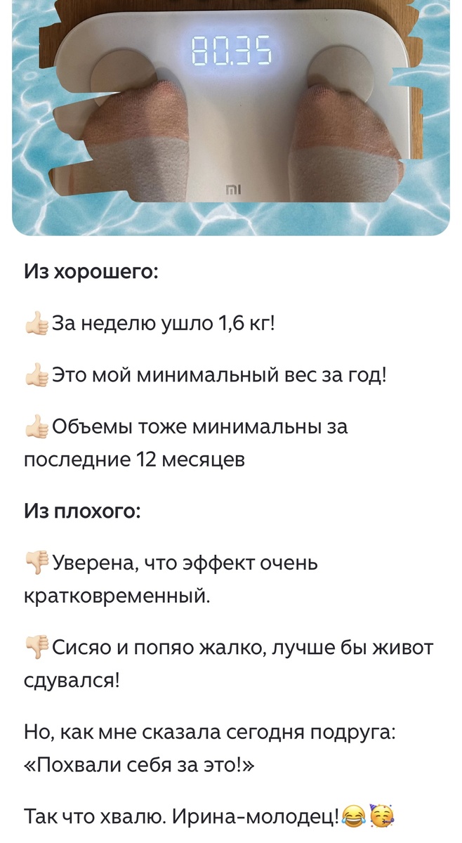 Я не худею в эти дни, не обжираюсь, но и не ограничиваюсь до своих любимых 1400-1500. Поход на весы сейчас принесет только дискомфорт, а не мотивацию!