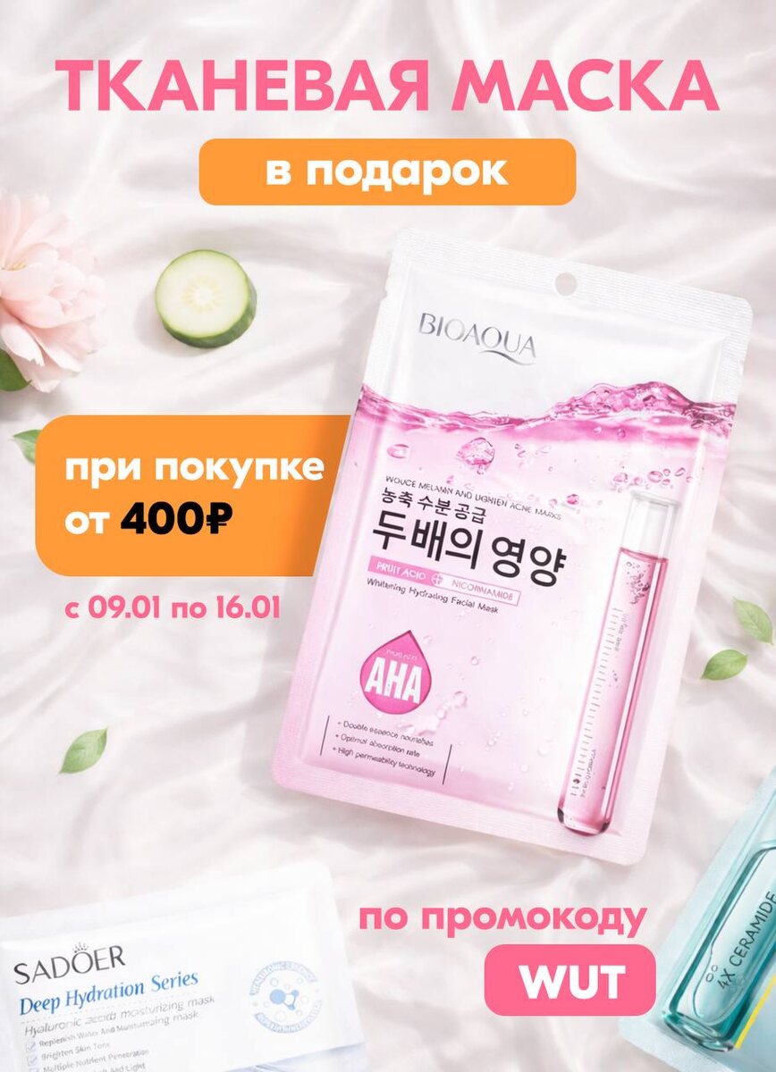 ! 1. Соверши покупку на 400 и более рублей. 2. Назови промокод WUT на кассе. 3. Маска твоя 🥳 ☝️ Акция действует до 16-го января включительно! ❕Какие маски участвуют в акции — уточняйте у продавцов-консультантов ❤️