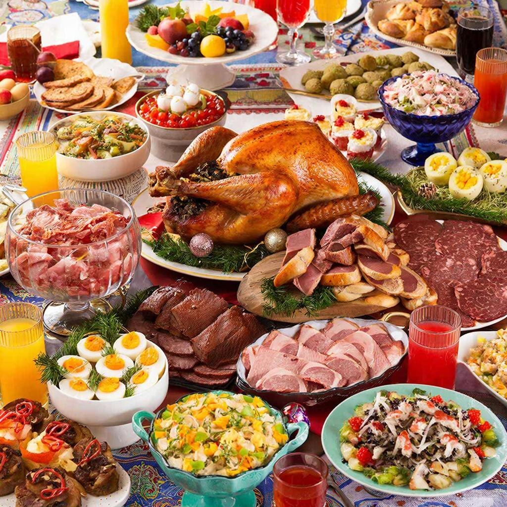 Самое важное событие Нового года — праздничный ужин. Традиционное меню русских людей включает разнообразные закуски, горячие блюда, десерты и алкогольные напитки. Средняя стоимость продуктов для семейного застолья достигает 10 000—20 000 рублей.