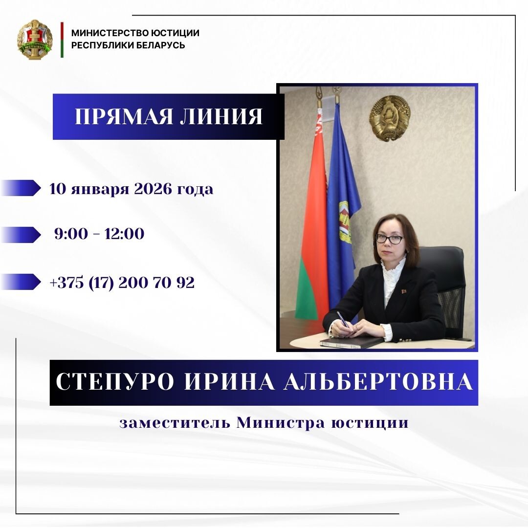 👥👥 🗓 10 января 2026 года с 9:00 до 12:00 прямую телефонную линию по актуальным вопросам деятельности Министерства юстиции проведет заместитель Министра юстиции Степуро Ирина Альбертовна. 📞 8 017 200 70 92 💪💪💪💪| Сайт | Telegram | Instagram | Fb | X | Ok | VK | YouTube