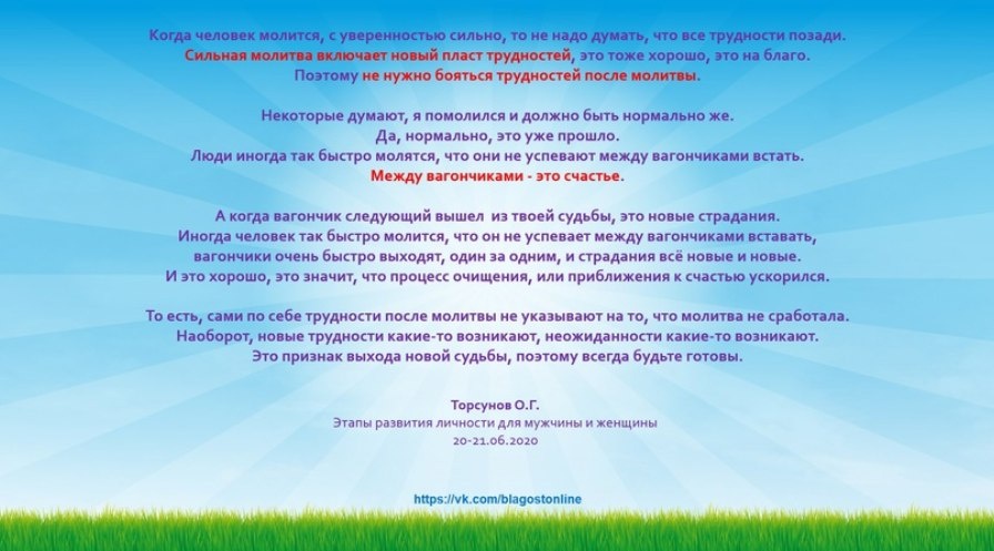 СИЛЬНАЯ МОЛИТВА ВКЛЮЧАЕТ НОВЫЙ ПЛАСТ ТРУДНОСТЕЙ, это тоже хорошо, это на благо. Поэтому не нужно бояться трудностей после молитвы. Некоторые думают, я помолился и должно быть нормально же. Да, нормально, это уже прошло. Люди иногда так быстро молятся, что они не успевают между вагончиками встать. Между вагончиками - это счастье. А когда вагончик следующий вышел из твоей судьбы, это новые страдания. Иногда человек так быстро молится, что он не успевает между вагончиками вставать, вагончики очень быстро выходят, один за одним, и страдания всё новые и новые. И это хорошо, это значит, что процесс очищения, или приближения к счастью ускорился. То есть, сами по себе трудности после молитвы не указывают на то, что молитва не сработала. Наоборот, новые трудности какие-то возникают, неожиданности какие-то возникают. Это признак выхода новой судьбы, поэтому всегда будьте готовы.
