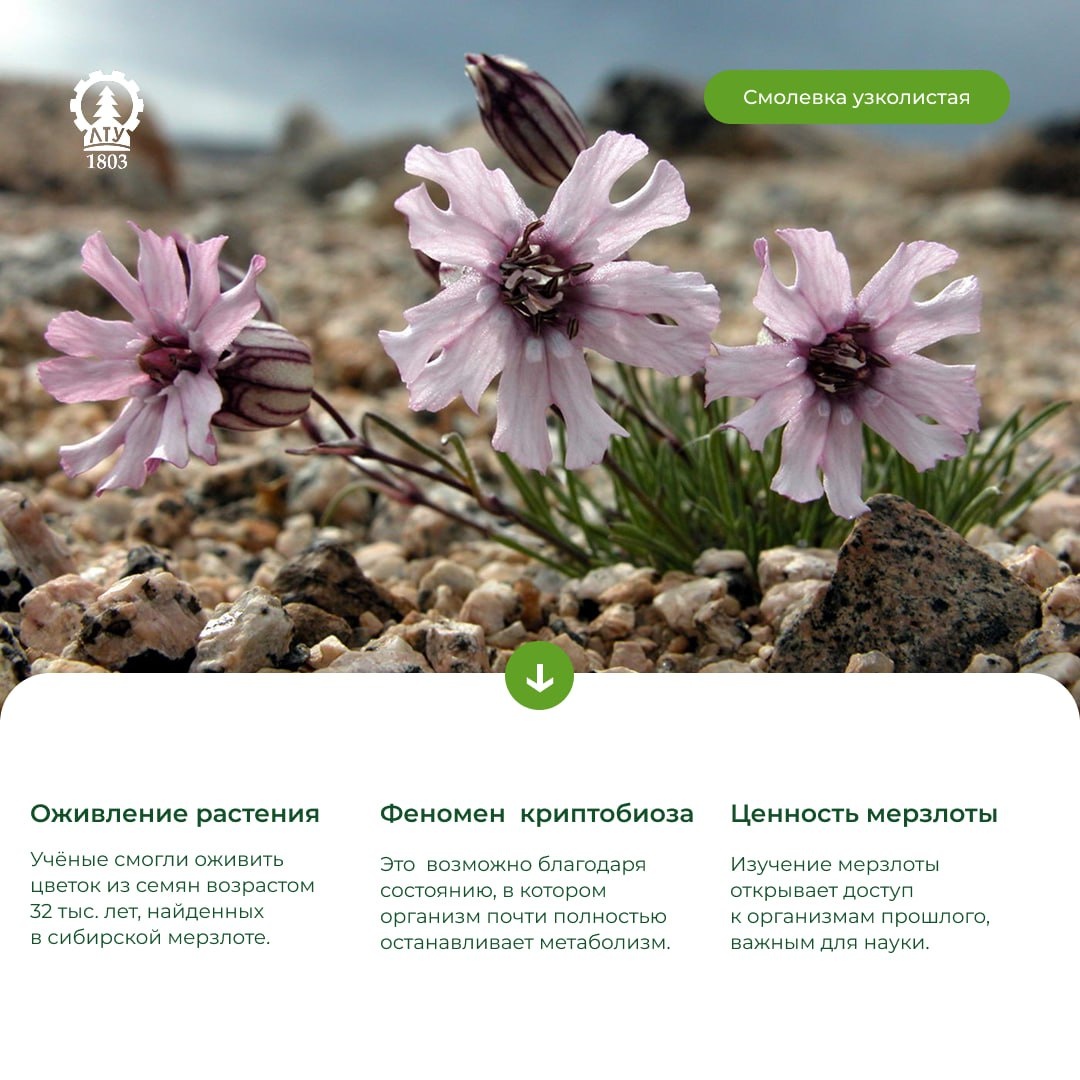 ❄️ А вы знали, что семена могут «спать» тысячелетиями и успешно просыпаться? 🍃 Научный факт В 2012 году российские ученые из Института физико-химических и биологических проблем почвоведения РАН оживили растение (Смолёвку узколистную), чьи семена пролежали в вечной мерзлоте на глубине 38 метров около 32 000 лет 🍃 Как это возможно? Это явление называется криптобиоз. Организм практически полностью останавливает метаболизм, защищая ДНК от повреждений. Растение не просто выросло, но и дало здоровые семена 🍃 Вечная мерзлота — её изучение имеет важное значение для науки и человечества А какое растение вы бы хотели «воскресить» из прошлого? 👇