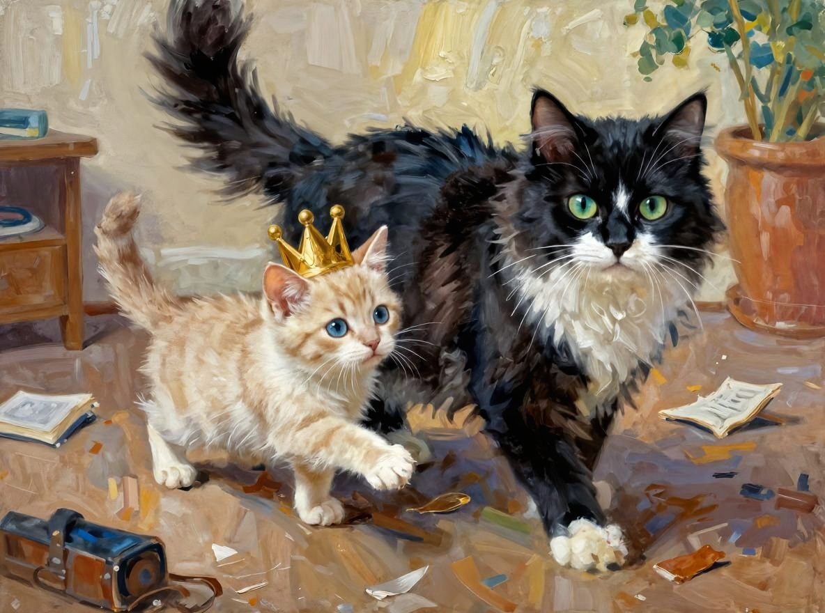 Глава 1. Кто я такой? Привет-привет, дорогие друзья! Я — Ваня, пушистый комочек счастья (ну, почти комочек — скорее, такой увесистый мячик с лапками). Давайте знакомиться поближе! Мой окрас — ред-поинт, но мама почему-то упорно зовёт его «кремовым». Ну что ж, мамам виднее, хотя «ред-поинт» звучит куда солиднее, правда? Мои глаза — два голубых озера, в которых можно утонуть (если, конечно, вы не боитесь намочить усы). А ещё у меня есть ласковое прозвище — Булочка. Да-да, именно так! Всё из-за моей пышной фигуры, которая, по мнению некоторых, напоминает аппетитную сдобу. Но я не обижаюсь — звучит ведь вкусно! А имя моё — Ваня — досталось мне не просто так. В детстве я был белее снега, прямо как ванильный крем! Среди всех котят в помёте я выделялся самой светлой шёрсткой. Можно сказать, я был настоящей звёздочкой с самого рождения! Глава 2. Первые испытания Но давайте не будем думать, что моя жизнь — это сплошные лакомства и поглаживания пузика. Были в ней и тёмные полосы… Я всегда был ж