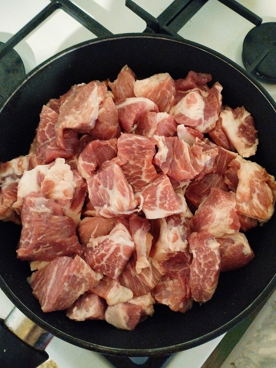 Смазываем сковороду подсолнечным маслом. Выкладываем мясо. Солим и перчим.
