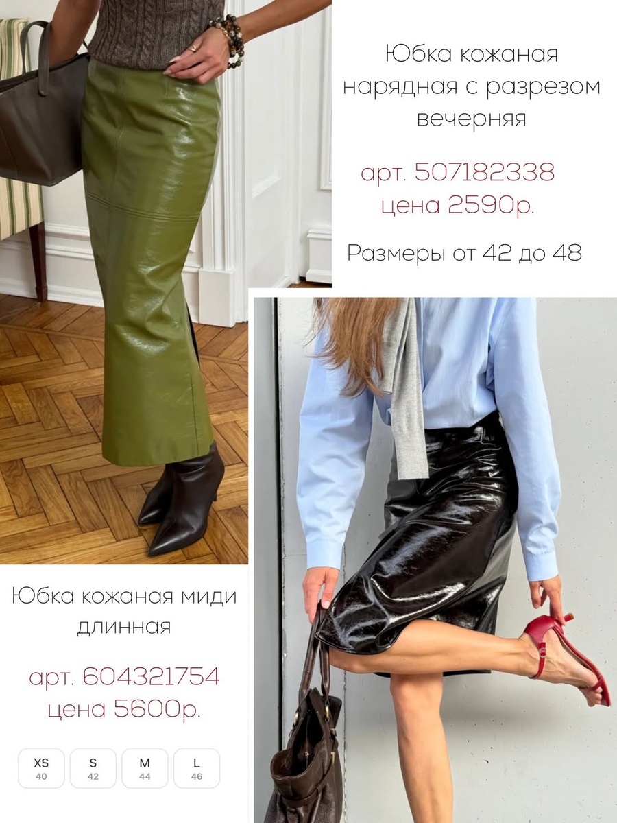 Эта подборка — готовая капсула, где можно легко переключаться между «уютно» и «эффектно». Две кожаные юбки закрывают и вечерние выходы, и стильные будни. Два тёплых костюма отвечают за комфорт и собранность без усилий. А топы дают ту самую магию: один — сияние, другой — нежность и многослойность. Кожаные брюки добавляют характер и делают образ современным даже с самым простым трикотажем.