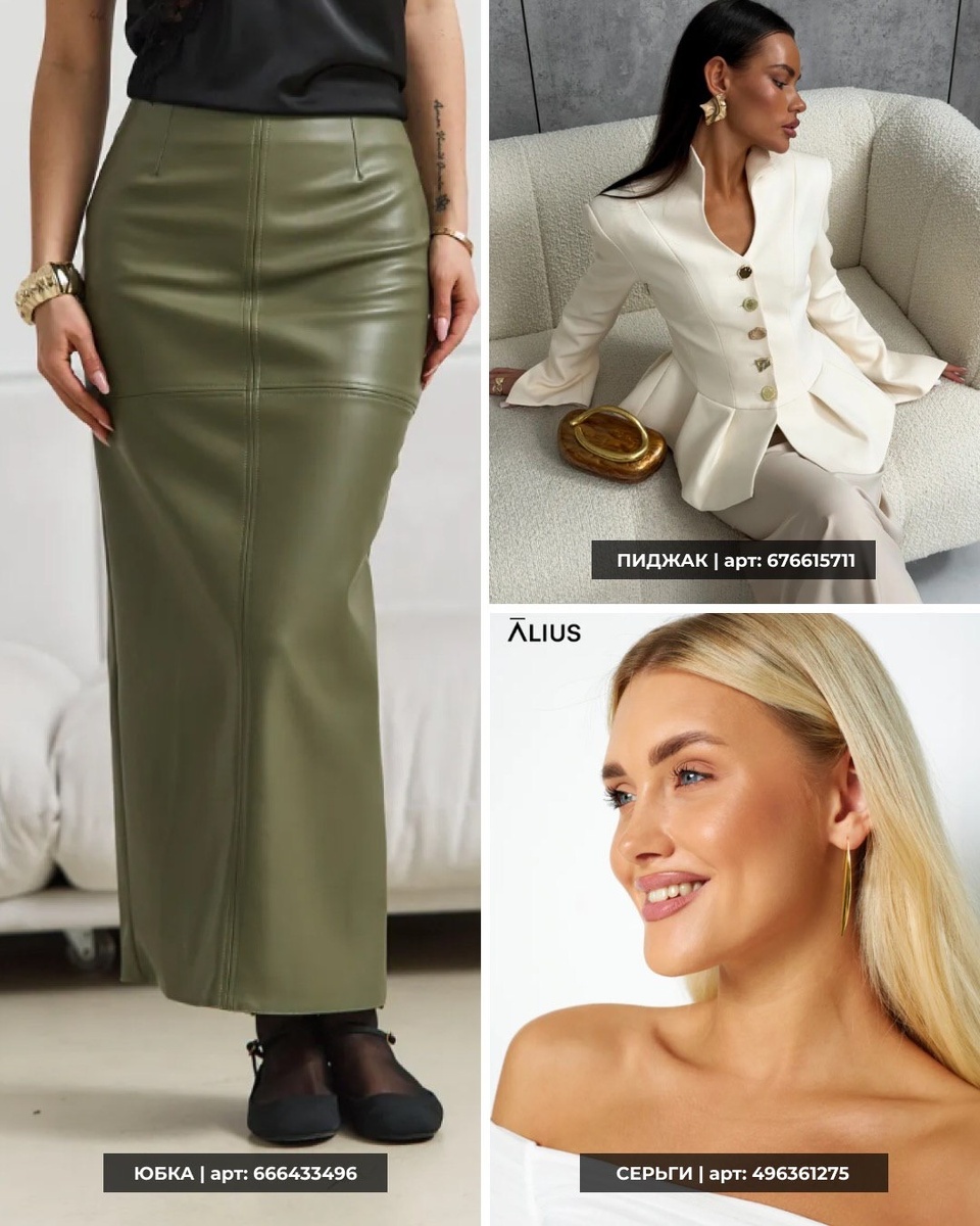 Эти находки легко складываются в капсулу, где всё сочетается между собой: оливковая юбка даёт характер, молочный пиджак строит идеальную талию, белая рубашка добавляет модный объём, сумка и серьги создают «точки дороговизны», а сапоги вытягивают силуэт и делают миди-длину максимально эффектной. В итоге получается гардероб, который работает без лишних усилий: меняете верх и аксессуары — и один и тот же низ звучит по-деловому, по-вечернему или по-повседневному.