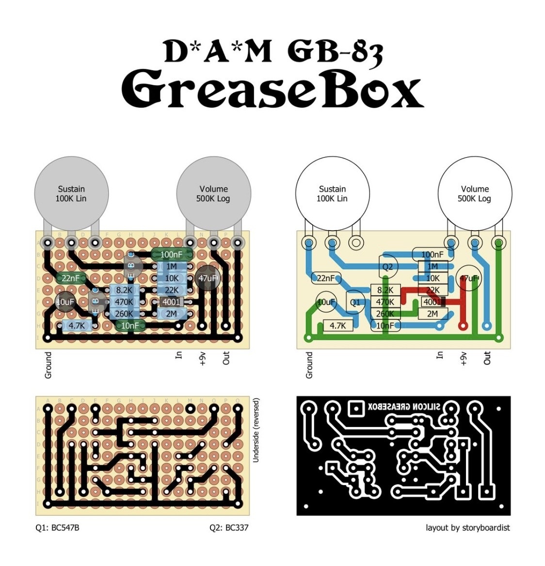 Dam GB 83 Grease Box — это педаль эффектов (овердрайв/дисторшн) от известного британского бренда Dam (David Alexander Moyle). "GB" скорее всего означает "Grit Box" или просто является частью названия модели. "Grease Box" (букв. "смазочная коробка") — это метафорическое название, намекающее на "жирный", "грязный" и "вязкий" звук.
