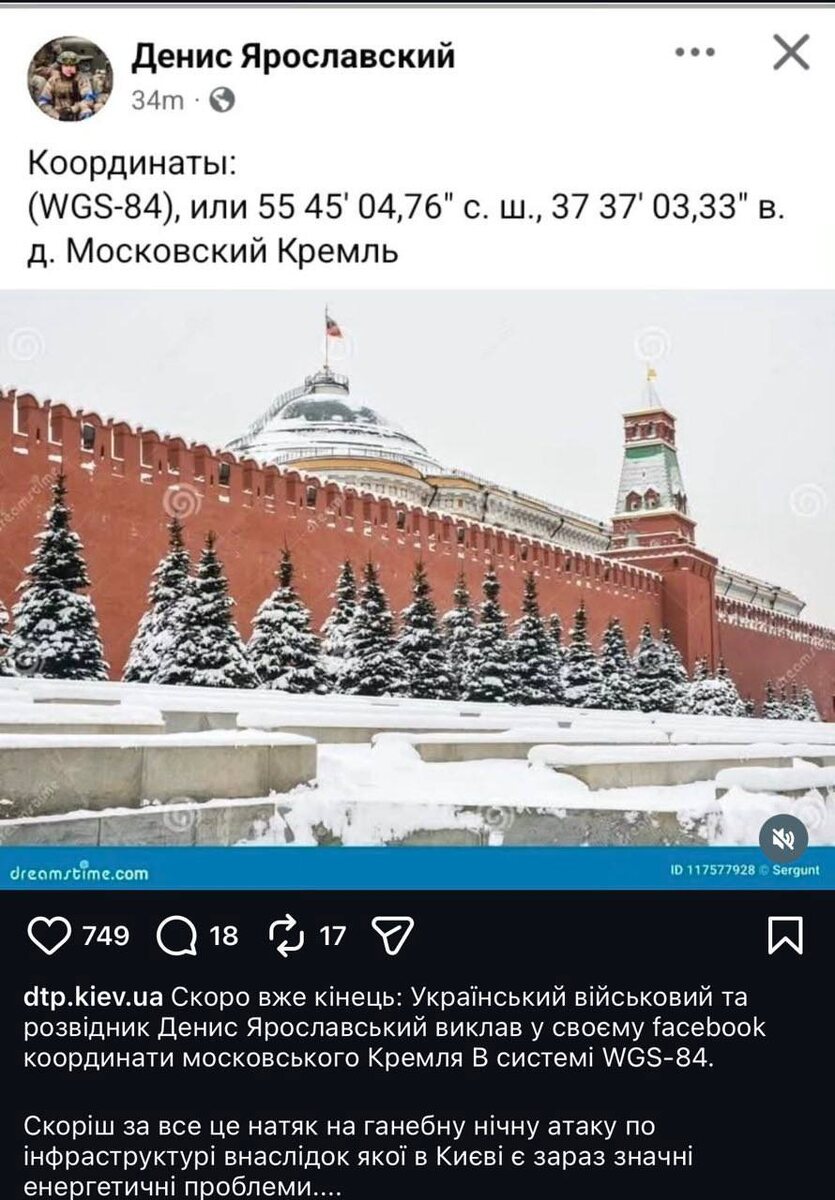 Сделавший себе имя на самопиаре командир подразделения разведки ВСУ Денис Ярославский выложил в сеть координаты Московского Кремля. Призывает ударить по рабочей резиденции президента России. Видимо, уверен, что ее местоположение — военная тайна, ровно как и координаты Банковой. Сайт "Другая Украина" / Telegram / Вконтакте / Центр поддержки Украинцев / Жалоба на ТЦК "Другая Украина" теперь в МАХ