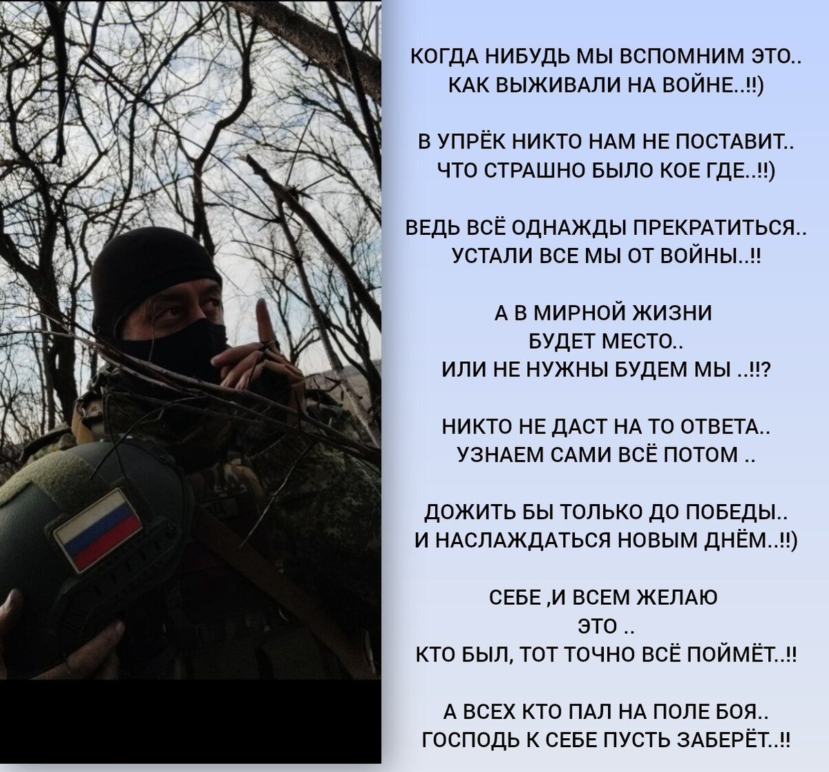 , Как выживали на войне. В упрёк никто нам не поставит, Что страшно было кое-где. Ведь всё однажды прекратится — Устали все мы от войны. А в мирной жизни будет место, Или не нужны будем мы? Никто не даст на то ответа, Узнаем сами всё потом. Дожить бы только до победы И наслаждаться новым днём. Себе и всем желаю это — Кто был, тот точно всё поймёт. А всех, кто пал на поле боя, Господь к себе пусть заберёт. Лирика от: «Дедушки», 11 рота 1430 гвардейский полк Подписаться | Связаться с полком Служить в полку