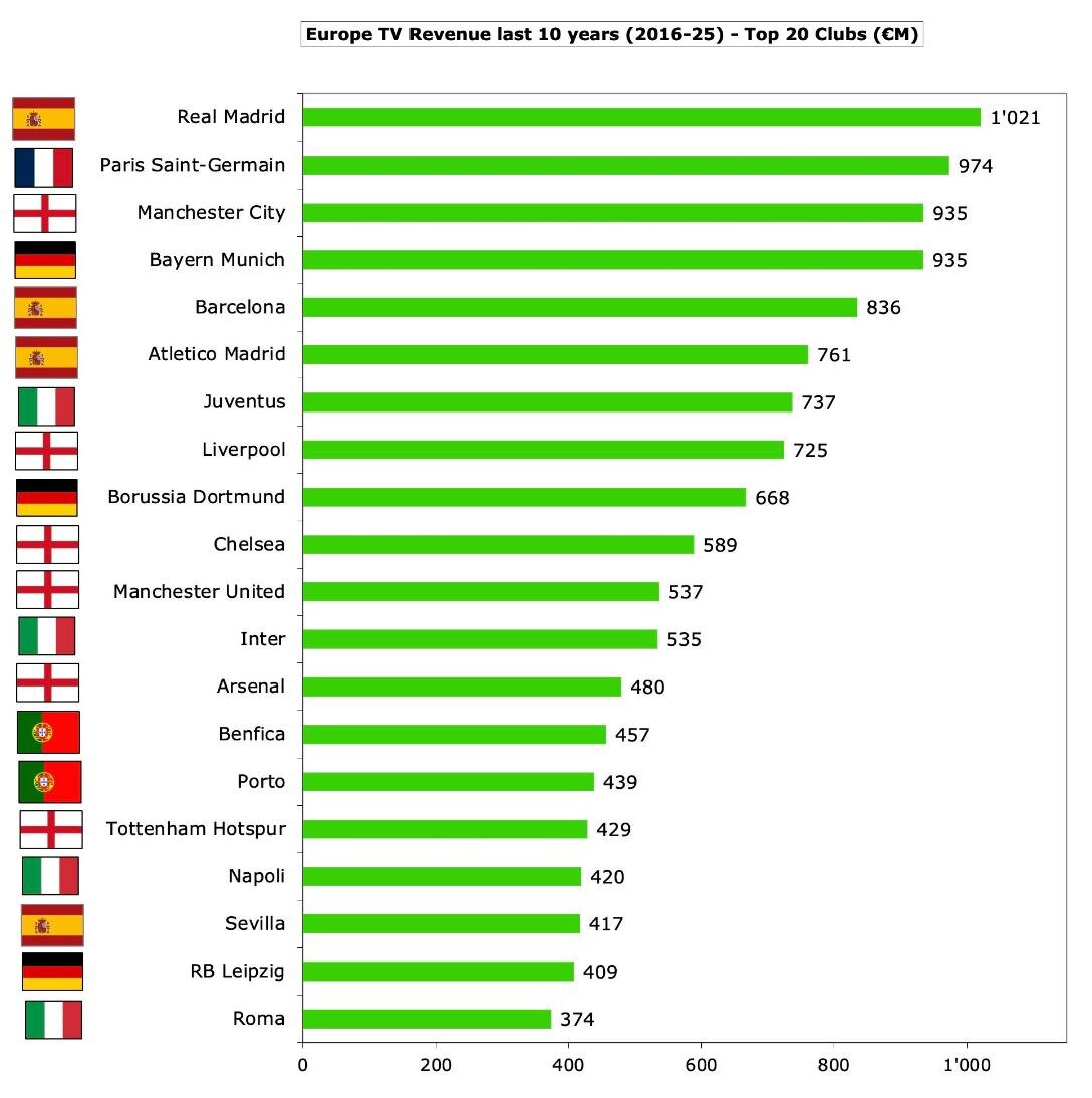 🗣 Swiss Ramble суммировал доходы клубов от еврокубков с сезона-2015/16. Считали все доходы, начиная с группового этапа в каждом турнире УЕФА. Единственное исключение – доходы клубов, выбывших в плей-офф ЛЧ ● Мадридский «Реал» за этот период взял пять ЛЧ – это принесло в кассу суммарные €1.021b. Это единственный клуб, который перешагнул за миллиардный рубеж ● Далее – «ПСЖ» (€975m), «Ман Сити» и «Бавария»(по €935m), у которых по одному титулу за этот период ● «Барса» – пятая (€836m), «Атлетико» – шестой (€761m). То есть в первой шестерке половина – это испанские гранды. ⚽️ Подписывайтесь на нас в MAX