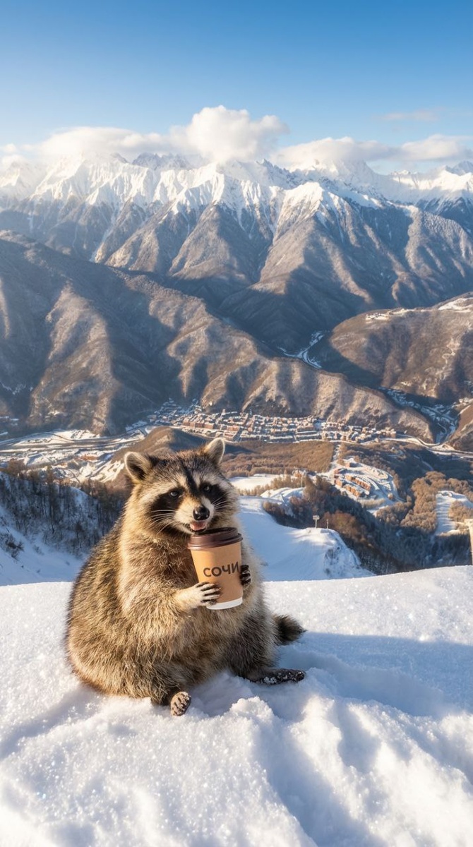 Идем в NanoBanana, загружаем фото места, пишем промпт, заменяем в скобках на свое описание. A photorealistic [животное] sits in the scene from the reference image, holding a paper cup with "[лого или текст]" on it. The [животное] takes a sip, smiles, and hugs the cup. Bright sunny day, fluffy snow reflects sunlight creating sparkles. Vertical format, 9:16 aspect ratio. Анимировал в Veo3.1 Можно попробовать в king или grok. Для анимации использовал👇 Static camera with extremely slow, almost imperceptible zoom towards a photorealistic wild animal sitting in snowy mountain landscape. The animal holds a paper coffee cup, slowly and tenderly hugging it with both paws, gently pressing it closer to its chest. Very slow and smooth nuzzling of muzzle against the cup rim and upper edge, savoring every moment with pure contentment and bliss. Soft breathing with visible breath in cold air. Minimal subtle movements: peaceful blinking, barely noticeable gentle shifts. Sharp focus on animal and cup,