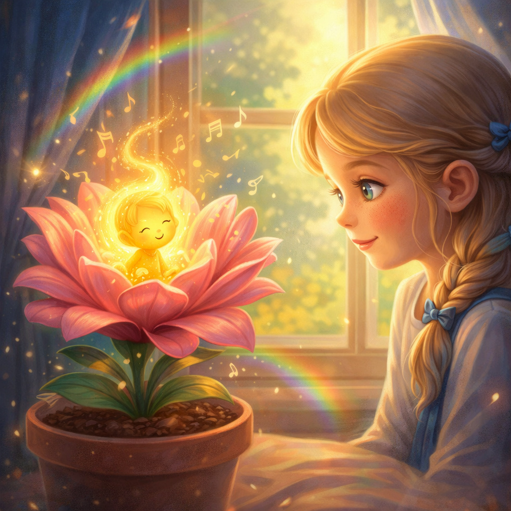 Аня ахнула. Она подошла ближе и услышала тихую, волшебную мелодию. Девочка с добрым сердцем всё поняла без слов. Она осторожно, вместе с комком земли, выкопала Мию, принесла домой и пересадила в красивый глиняный горшок, который поставила на самый солнечный подоконник.