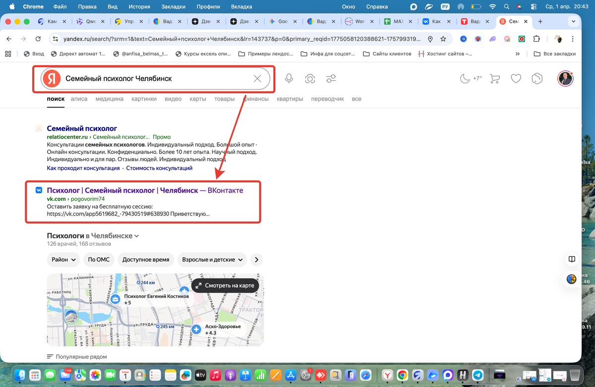 «Психолог Москва», «Коуч Челябинск», «Семейный терапевт Урал» — это фильтр для «своих» клиентов и плюс для локального SEO.