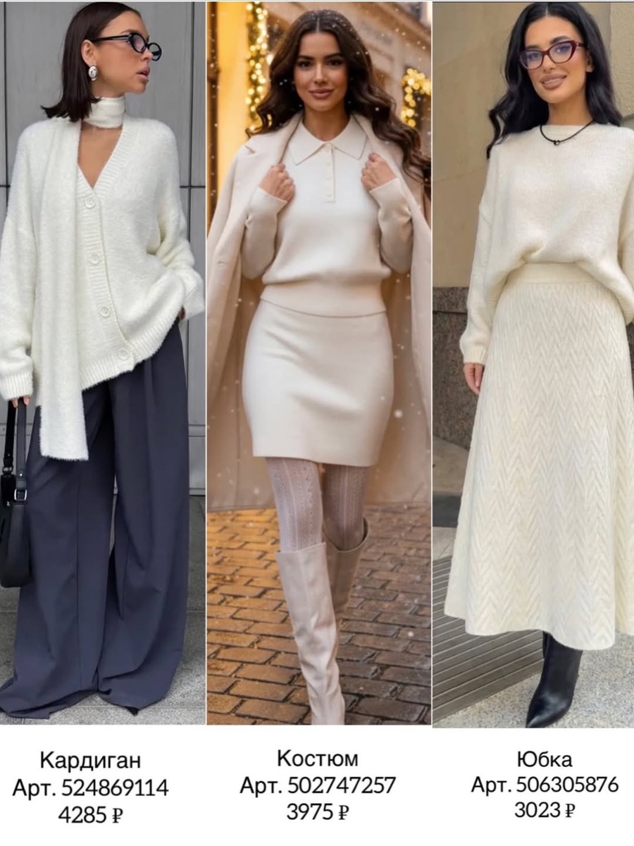 Эта подборка — как готовый гардероб на два настроения. Сливочная часть отвечает за нежность, чистоту и мягкую элегантность: кардиган, светлый костюм и фактурная миди-юбка легко собирают образы «ухоженной девушки». Шоколадная часть — за эффект и глубину: шуба, приталенный костюм и длинное платье дают тот самый «дорогой» драматичный шик.