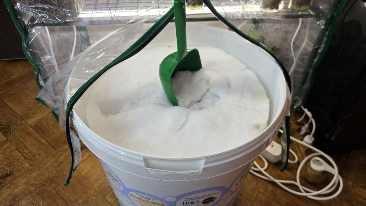 Аж 40 литров домой притащили. Ассистенты уже поигрались в снежки по линолеуму. Тает.