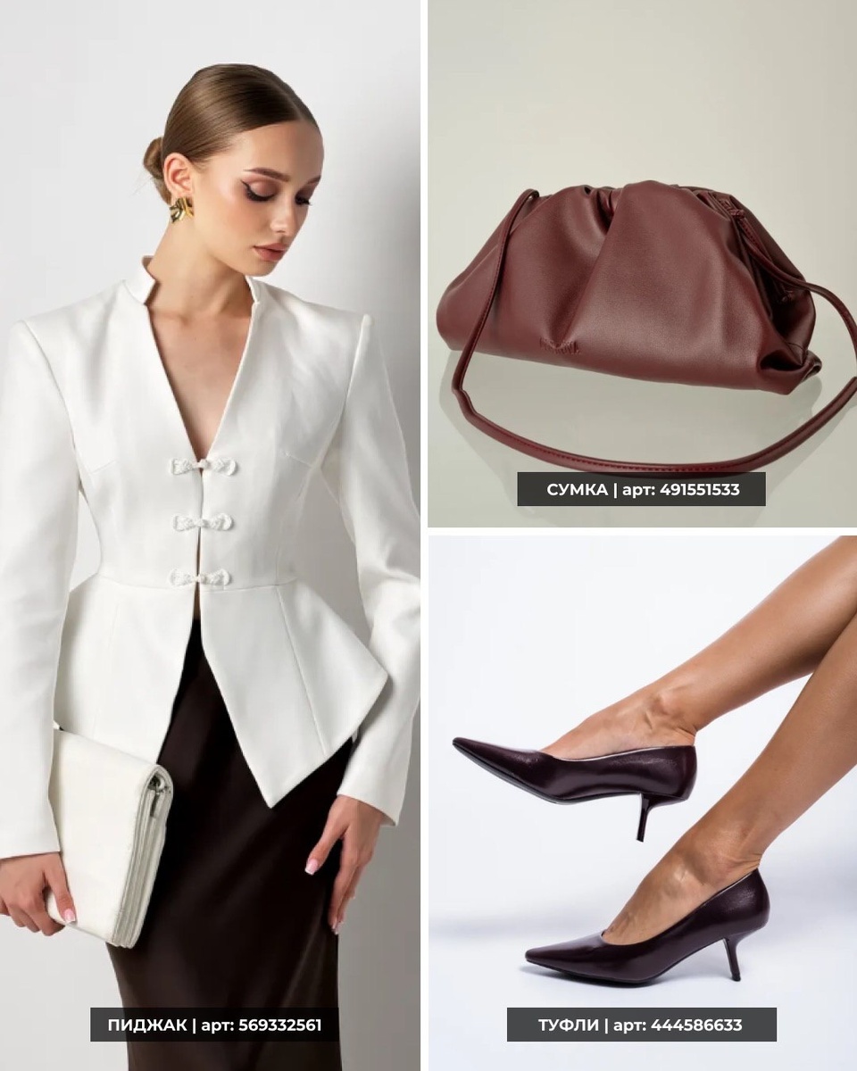 Эта подборка — про уверенный стиль без суеты: белый пиджак задаёт архитектуру, шоколадные брюки вытягивают ноги, блузка добавляет воздуха, платье делает фигуру выразительной, а аксессуары собирают всё в цельную историю. Здесь легко составить и деловой образ, и вечерний, и «на каждый день, но красиво»: достаточно поменять сумку, обувь и украшения — и настроение меняется полностью.