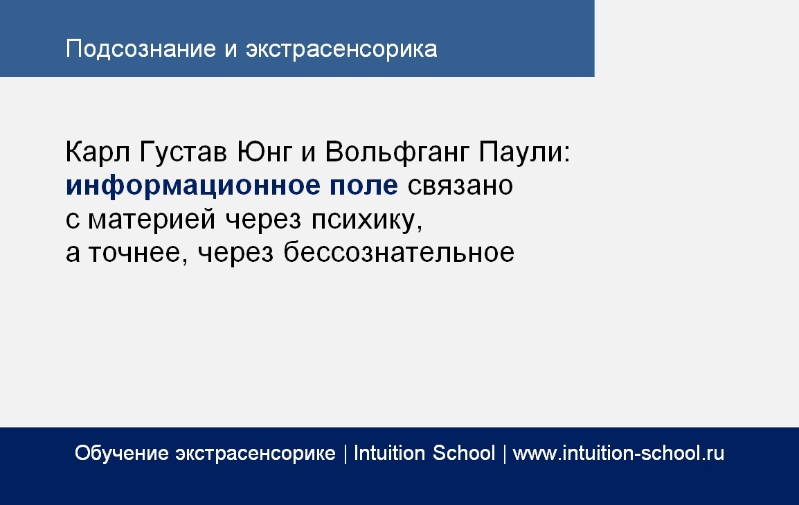 Дорогие друзья, в этой статье речь пойдет об информационном поле, а именно о том, что о нем думали Карл Густав Юнг и Вольфганг Паули. Я же хочу сказать, что практика экстрасенсорного восприятия подтверждает вывод о наличии чего-то, что получило название «Информационное поле». Информационное поле состоит из впечатлений людей, как живых, так и умерших: это мысли, идеи, знания людей, их эмоции, чувства. Поэтому можно сказать, что информационное поле – это поле сознаний. Подсознание человека имеет доступ к этому полю, поэтому и осуществляется экстрасенсорное восприятие. Что такое информационное поле? Это образование, которое порождено сознаниями людей. Подсознание имеет доступ к информационному полю Итак, о Юнге и Паули. Не многие знают, что Карл Густав Юнг изучал еще и парапсихологические явления, связанные с интуицией, экстрасенсорным восприятием и «неслучайными случайностями», которые называют также явлениями синхронизма. Изучением последнего вопроса Карл Густав Юнг занимался вместе со