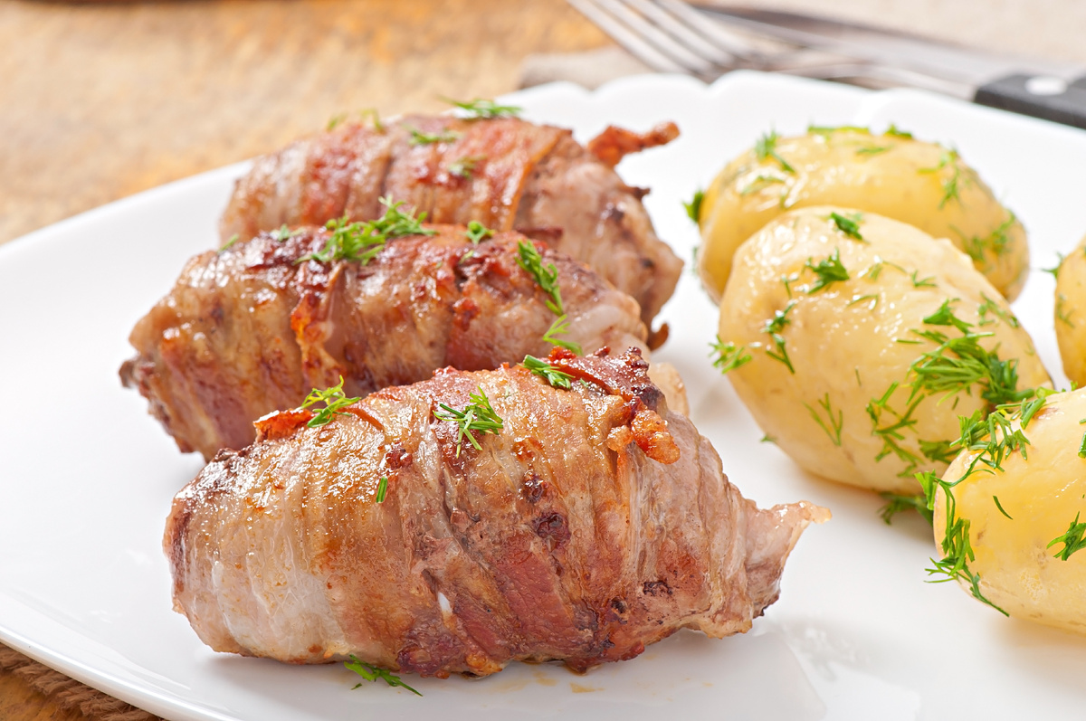 - Аккуратно, но плотно сворачиваем мясо в рулет. Перевязываем нитью. Солим и перчим снаружи.