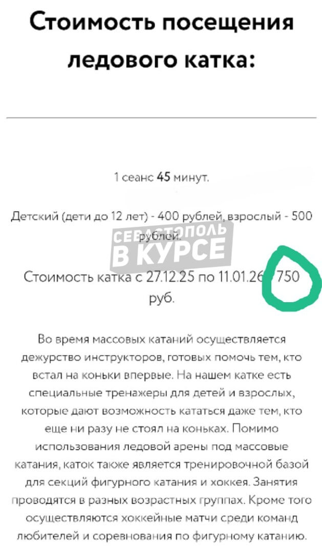 : Возмущение по поводу нашего чудо-катка на Муссоне! На период каникул задрали цену - для всех категорий (и дети, и взрослые) 750₽ за 45 мин! Ради интереса посмотрела цены на посещение катка в столице. В парке Сокольники шикарный каток предоставляет сеанс в 1.5 часа за гораздо более скромную плату. Например, дети из многодетных семей (как у меня, кстати) могут полтора часа кататься за 350 ₽! На Муссоне я за удовольствие в 45 мин заплачу 2250 за троих детей. Аппетиты у вас, уважаемый Муссон, однако! Придется отложить активный отдых до окончания каникул(( 💿Мы в MAX — подпишись! 🔴Подписаться на Севастополь в курсе