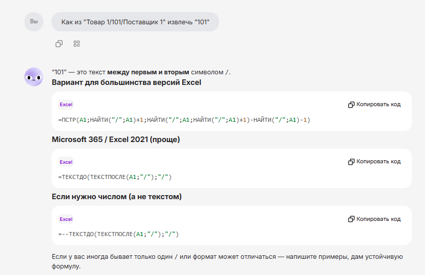 Для меня всегда сложно давались текстовые формулы в excel. Во-первых, я пользуюсь ими очень редко, а во-вторых, уж они очень они длинные. Как, например, можно запомнить такое =ПСТР(A1;НАЙТИ("/";A1)+1;НАЙТИ("/";A1;НАЙТИ("/";A1)+1)-НАЙТИ("/";A1)-1) эта длинная формула нужна всего лишь для того, что бы из строки "Товар 1/101/Поставщик 1" извлечь "101". Когда не было GPT, я искала ответы через обычные поисковики. Спрашивала, что-то в таком духе "как из текстовой строки в excel выделить нужную часть". Поисковик выдавал ссылки на сайты и видео, в которых нужно было искать аналог верного ответа. А GPT справляется с этой задачей очень просто В запросе я не писала про excel, так как в чате уже шла речь про него. В качестве эксперимента я решила вбить тот же самый запрос в поисковик, и получила такой ответ (вообще не про то, что хотела). А теперь я напишу для чего мне вдруг понадобилась эта формула. У меня была таблица в excel, которую я захотела улучшить: упростить работу при заполнении и сниз