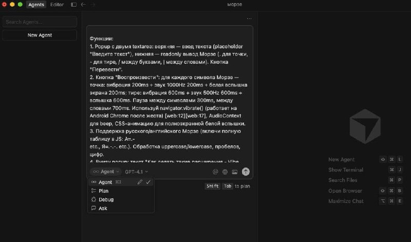 Как выглядит это расширение: https://www.loom.com/share/21faf73738384616b6683faa68524fe7 1. Просим perplexity подготовить промт для cursor (текст в комментариях) 2. Открываем Cursor (как на скриншоте), вставляем полученный промт и выбираем режим агент (для больших задач лучше сначала использовать режимы ask и plan) 3. Дописываем в чат Cursor "Открой твой терминал и создай сразу все файлы в папке #название папки# на рабочем столе", запускаем и ждем создания файлов 4. Открываем в хром - chrome://extensions/ и в правом верхнем углу переключаем в "режим разработчика", затем слева выбираем "загрузить распакованное расширение" 5, В правом верхнем углу Хром открываем ваше новое расширение и тестируем Если захотите выложить публично - спросите Cursor в режиме ASK как это сделать Для более сложных проектов читайте гайд