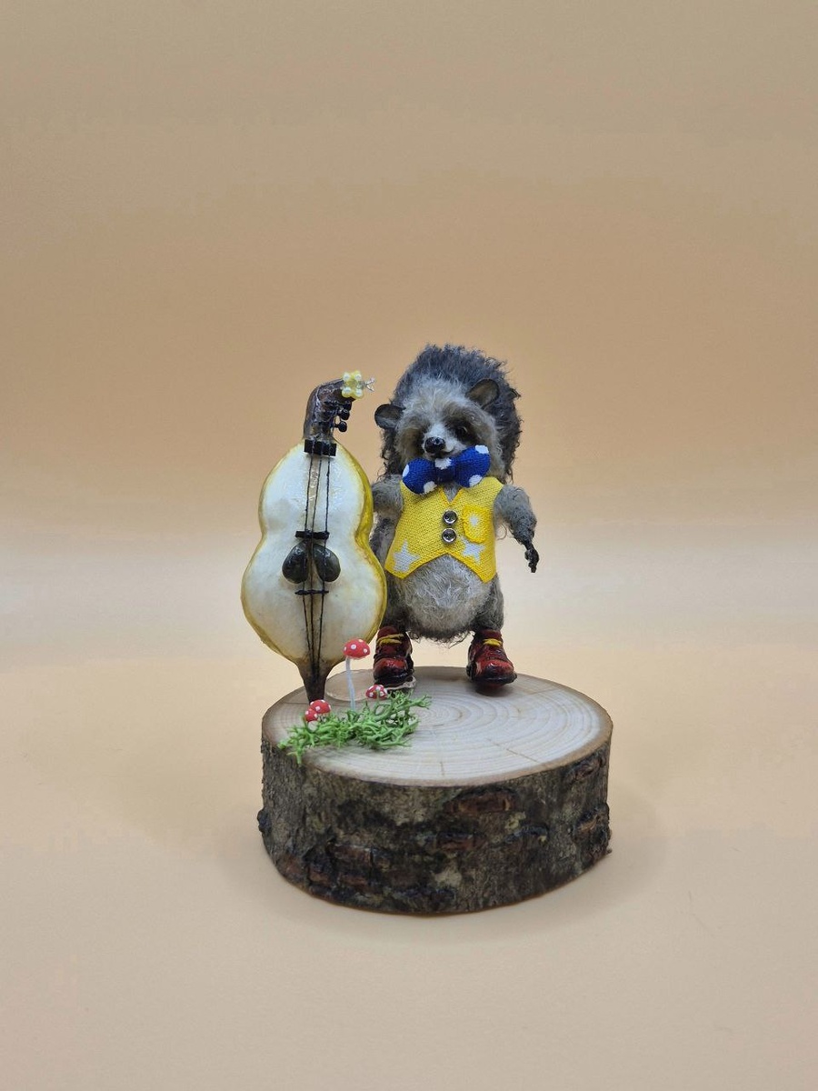 🦔 Маленький(7 см), но с большой музыкой в душе и контрабасом… из груши! Да-да, инструмент натуральный, сочный и очень музыкальный 😓 Евлампий — настоящий интеллигент: в жилеточке, стильной бабочке и ботинках ручной работы, потому что даже ёжик знает — образ решает 🔝 А на его контрабасе уютно примостилась крошечная бабочка всего 4 мм, как главный зритель и самый преданный фанат 🦋 Он играет тихо, по-ёжиковски душевно, так что музыка слышна сердцем 🎤 И если вдруг вам показалось, что в доме стало теплее и немного веселее — возможно, это Евлампий уже разогревает струны ❤️🔥✨