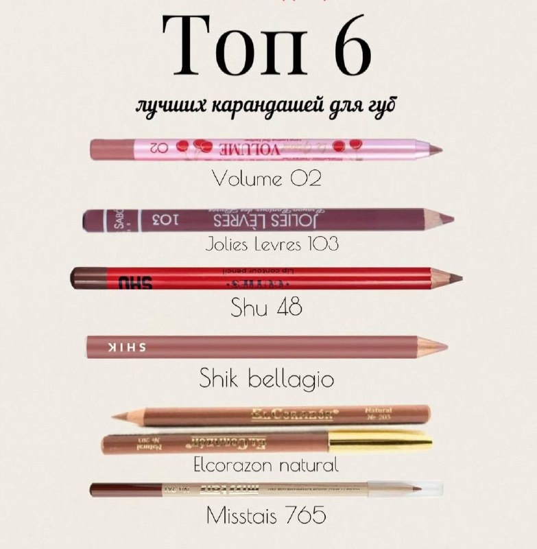 🤍 Оттенки, которые подходят под большинство помад и блесков — на каждый день и для особых случаев. Мои любимые уже много лет : • Volume 02 — нежный нюд, подчёркивает естественный цвет губ • Jolies Lèvres 103 — розово-коричневый, универсальный и аккуратный • Shu 48 — классический красный, для выразительных образов • Shik Bellagio — мягкий тёплый нюд, идеален на каждый день • Elcorazon Natural — натуральный бежево-коричневый оттенок • Misstais Style — ходовой оттенок 765 🤍 Сохраняй, чтобы не потерять ✨