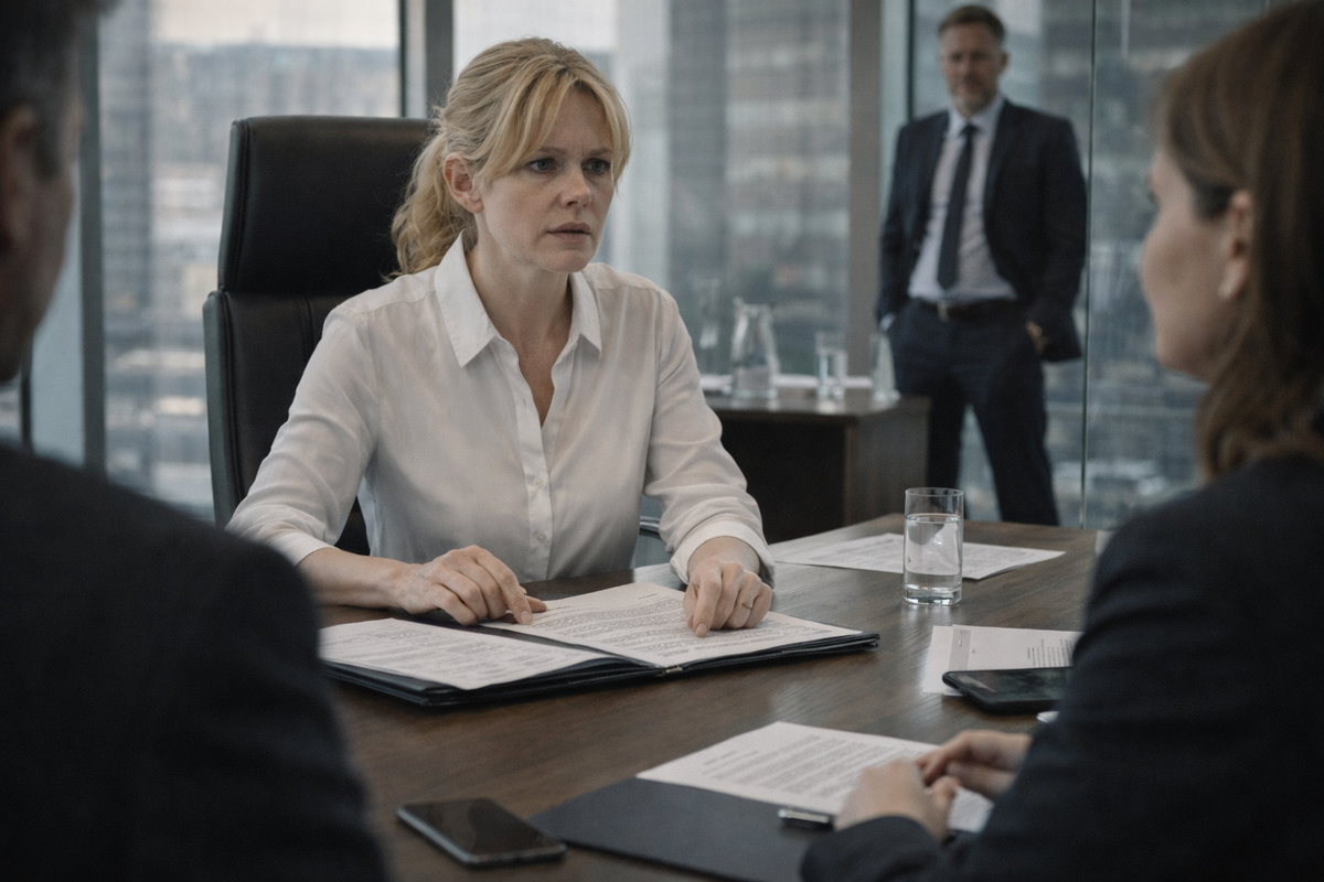 В переговорной пахло кофе и дорогой бумагой. На столе лежали папки, рядом — графины с водой, стаканы ровно в линию. Всё было выверено.