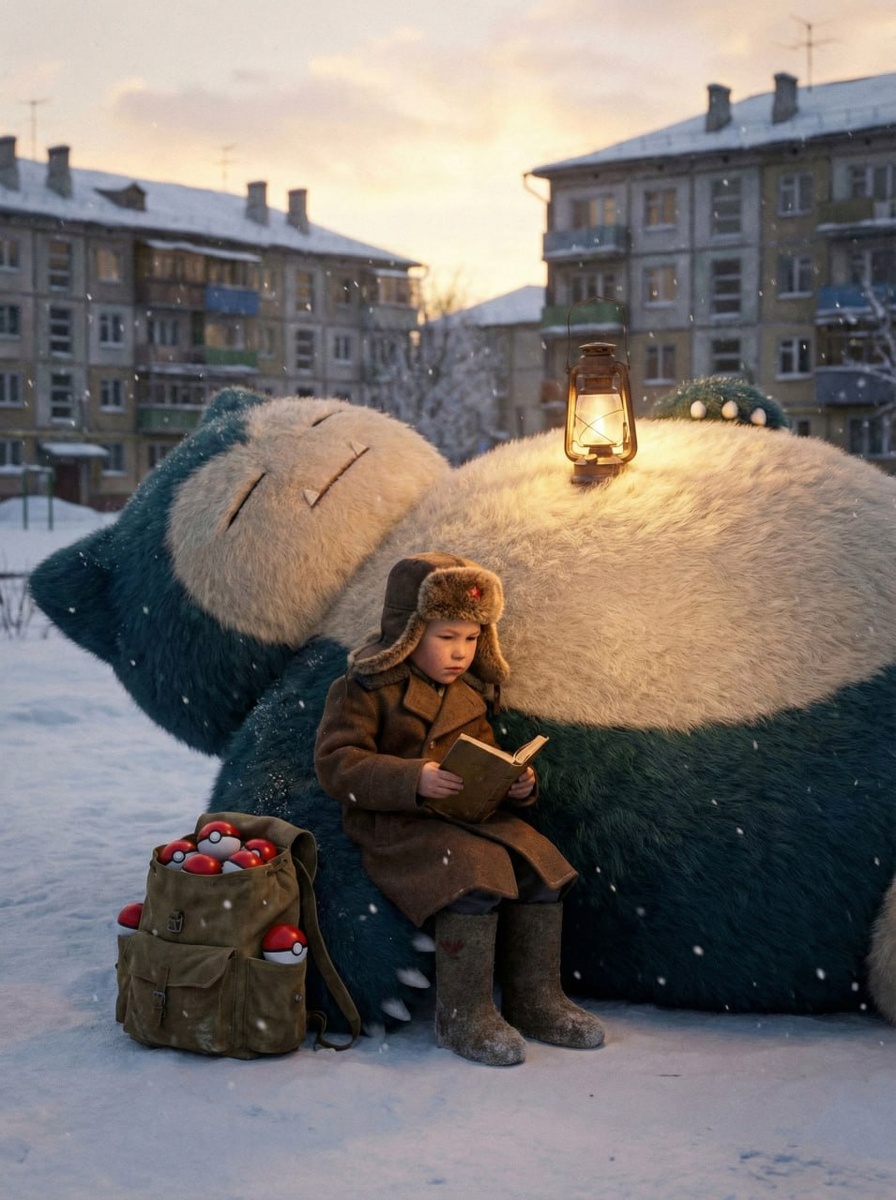 🔠🔠🔠🔠🔠🔠🔠⭐️ Промт из серии "Покемоны" 5 из 10 Промт адоптирован для мальчика 5 лет, меняем цифру на нужную и меняем BOY на GIRL 👉Генерирую тут Use the uploaded photo to reference your face and appearance. Keeping the facial features and not changing. Keep 100% similarity. A photo of a 5-year-old boy dressed A Soviet backpack full of pokeball, is in the winter clothes of a Soviet child A hat with earflaps, a brown coat, felt boots. The boy is sitting huddled against the warm, furry belly of a gigantic sleeping Snorlax that blocks a snowy village path. Soviet panel buildings are visible in the distance. The boy is looking at a small book by the light of the lantern resting on the Snorlax's fur. The Soviet atmosphere. Winter, quiet snowfall. resting pose. Unreal engine 5 render. octane render. realistic texture 4 k. Medium shot, eye-level camera, sunset, realistic photography, highly detailed textures, 8k resolution, romantic fantasy aesthetic. shot on Canon TX / Canon FD 50mm f