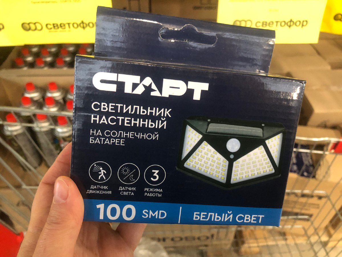 Привезли светильники настенные на солнечной батарее торговой марки Старт. Он с датчиком движения и датчиком света. Светит белым светом. 3 режима. Световой поток 500 Лм. У него аккумулятор на 1200 мАч. Время работы 6-8 часов. Размер 13х9,5х5 см. Материал: пластик, металл.