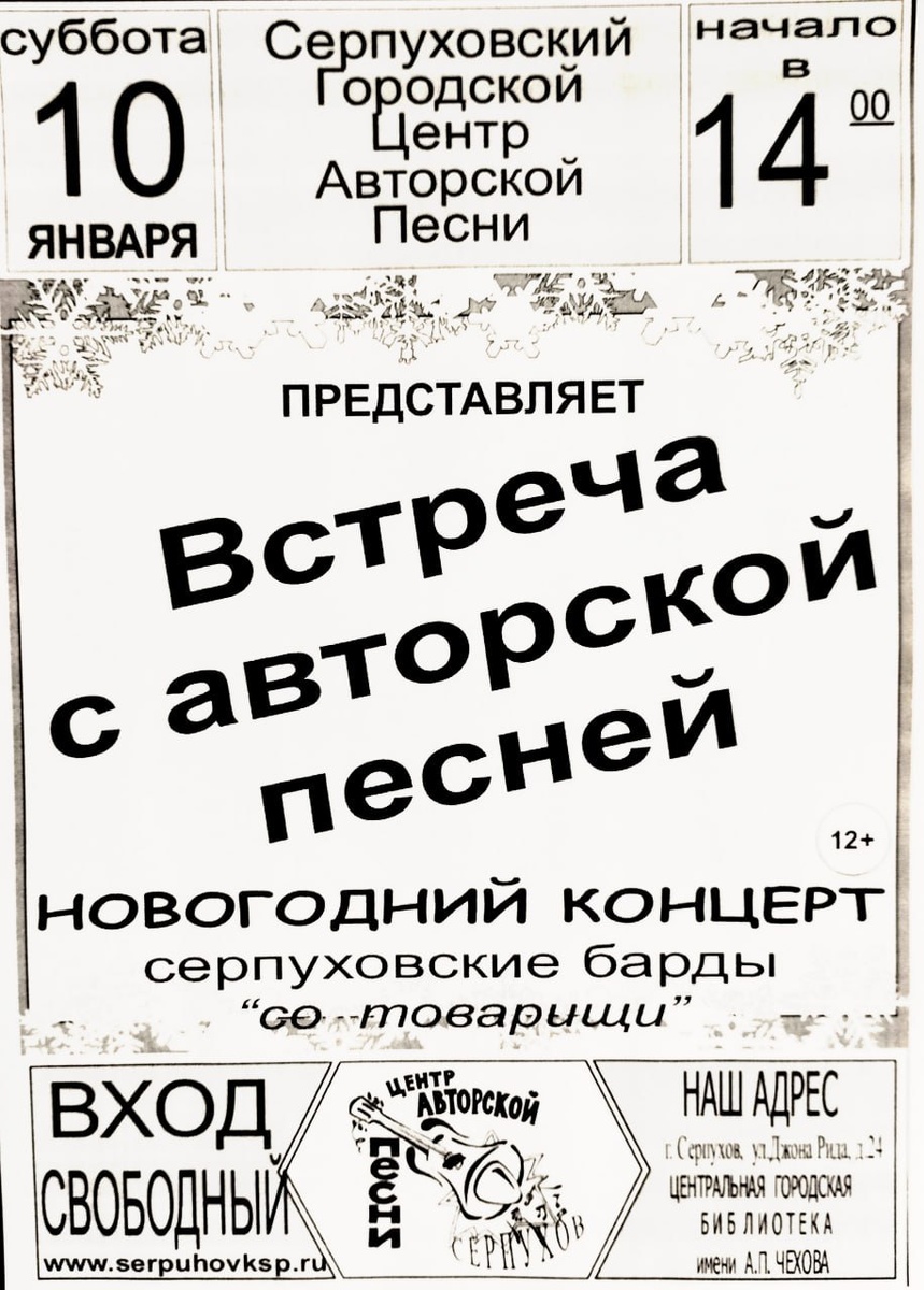 🎸Серпуховские барды подарят вам яркие и душевные выступления, наполненные искренними мелодиями и живым исполнением. 🔥Их песни согреют сердце теплом, приглашая в мир гармонии и романтики. 🚫 Возраст: 12+ 📆 10.01.2026 🕒 14:00 🏢 Центральная городская библиотека им. А. П. Чехова 📍 г. Серпухов, ул. Джона Рида, д. 24 💰 Вход свободный❗️ ⭐Поддержать канал голосом 💰 Канал Вакансии Серпухова ✅ Мероприятия Серпухов https://dzen.ru/id/66f01c6eb4c6fe60c9ca1608 http://vk.com/serpukhov_events http://dzen.ru/serpukhov_events