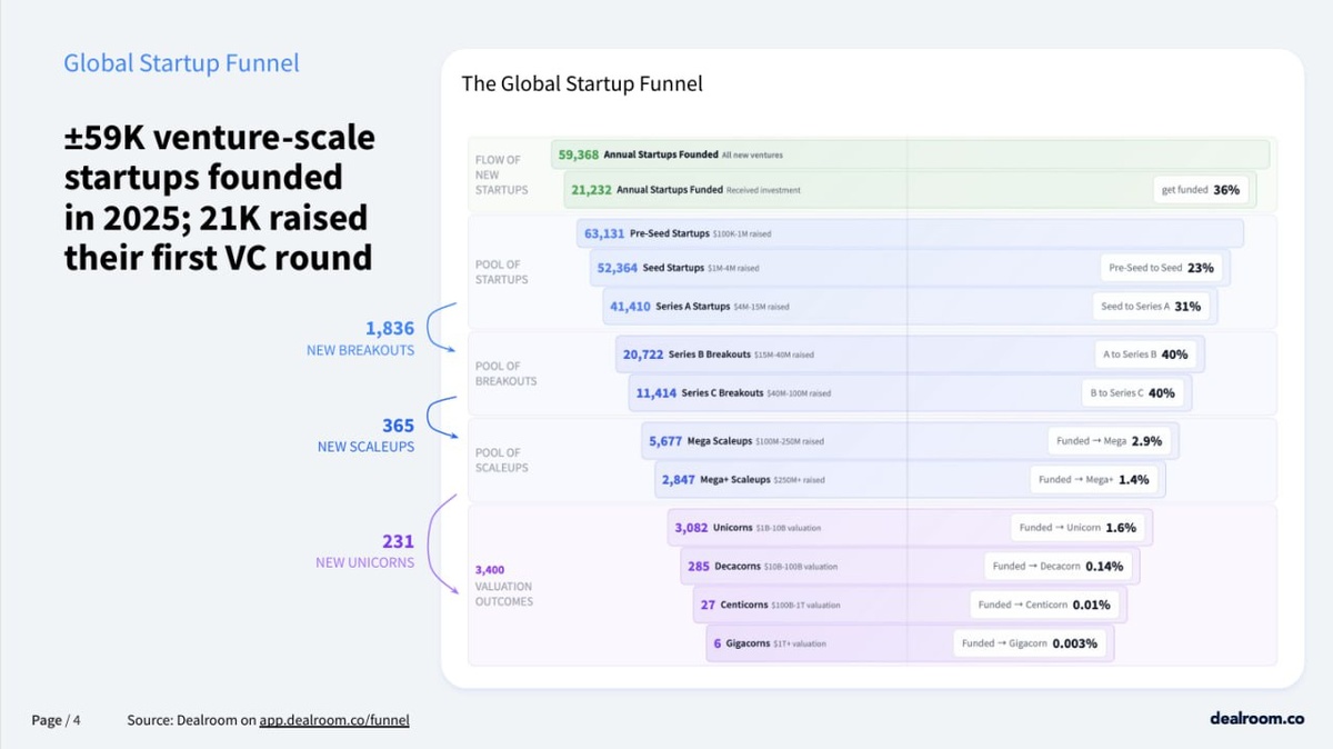 ! Начал рабочий год со свежего отчёта Dealroom о состоянии венчура в 2025 году и прогнозах на 2026. Внутри много интересных графиков, но сфокусироваться хочу на воронке глобального рынка стартапов. Если быстро пройтись по верхушке — в прошлом году появилось около 59 тыс. стартапов, примерно 21 тыс. подняли первый раунд. То есть шанс получить деньги почти сразу есть у каждого третьего стартапа. Дальше интереснее. На сегодняшний день насчитывается 63 тысячи пресид-стартапов. Значит, 42К подняли раунд в 2024 или раньше и готовятся к сиду. 1836 стартапов за год преодолели посевные стадии и пополнили ряды тех, кто уже на Series B. Вишенка на торте — 231 новый единорог. Это 7,5% от общего количества. И здесь надо сделать какие-то выводы, но они вполне очевидны. Интерес инвесторов к ранним стартапам крепнет, поднять раунд в первый год жизни стартапа — реально, не поднять — не стыдно, чеки всё ещё приходят к тем, кто лучше конкурентов понял проблемы рынка и нашёл изящное решение в духе вр