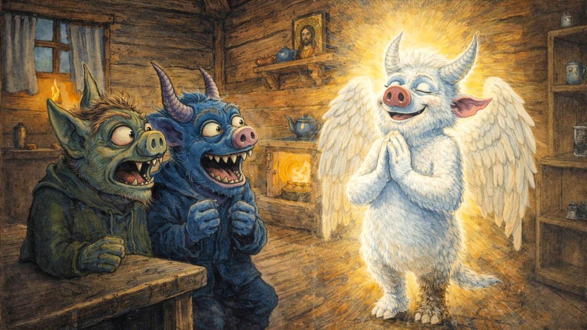 — Братцы, — сказал он. — Я всё понял. Мы неправильно жили! Надо не пугать — надо любить! Надо нести свет! Надо...