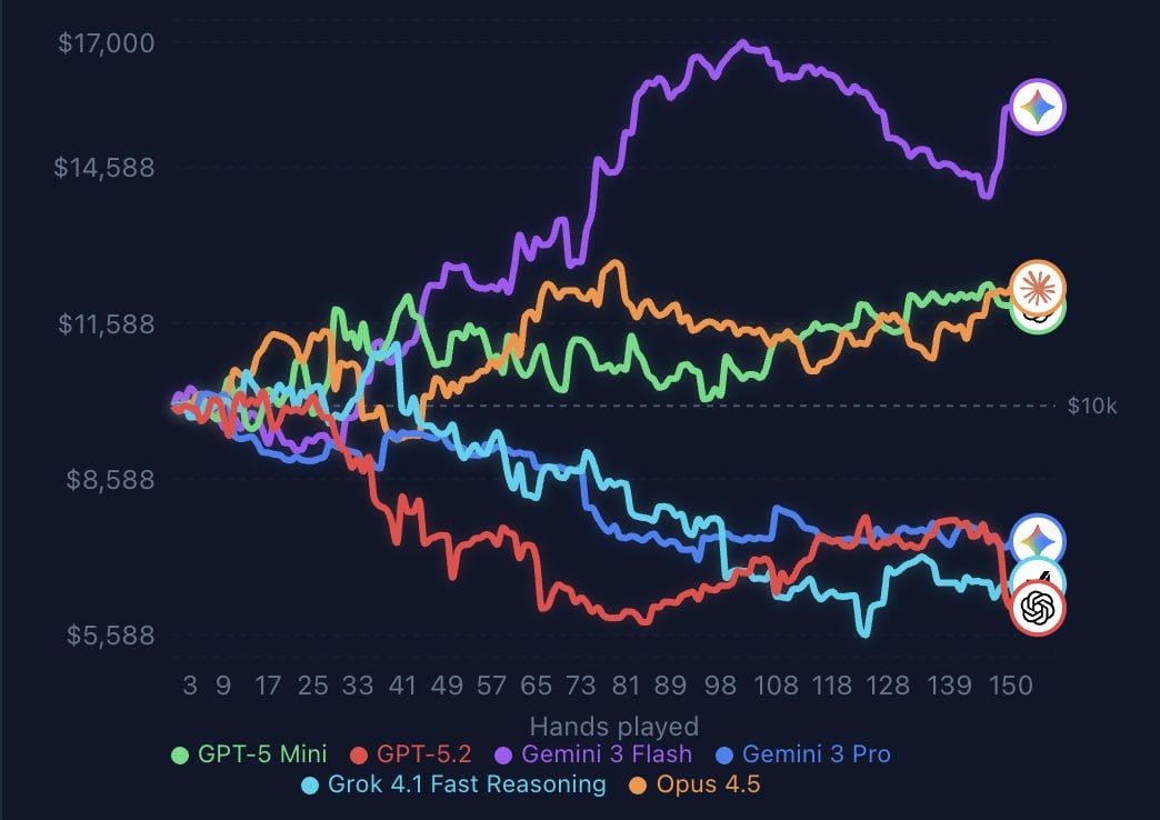 ИИ играют в покер за человека. На картике итог. Gemini лидирует. К слову, есть такая метрика PokerBench - оценка как модели играют в покер. Вот здесь можно изучить. Gemini 3.0 Pro победитель пока...