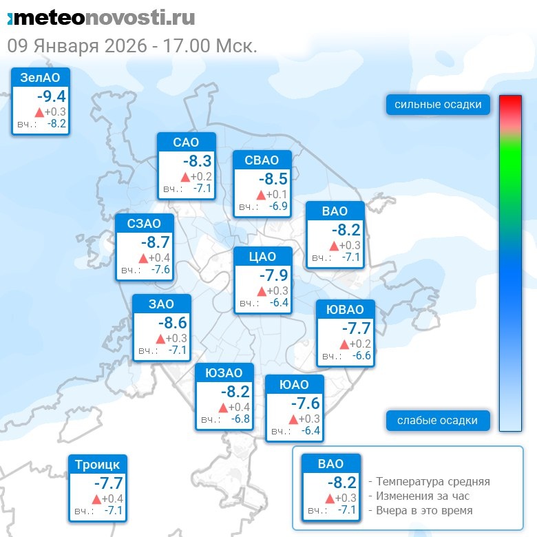 В 17:00 в Москве было от -9.5°C до -6.8°C, средняя температура -8.2°C #погода #Москва #зима #температура #9января #пятница