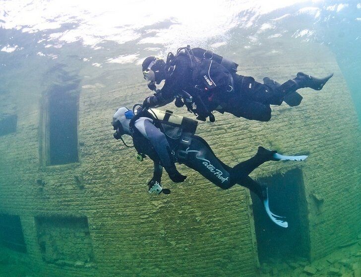 Пока Решетников выуживал бесценные раритеты, Веригин принялся собирать инструмент и снаряжение. Лосева хотела помочь ему и, согнувшись, чтобы не задеть головой низкий потолок, двинулась к Максиму, но поскользнулась и случайно толкнула ногой лежавший на краю площадки акваланг. Баллон, зацепив ремнями маску, потянул её за собой в воду.