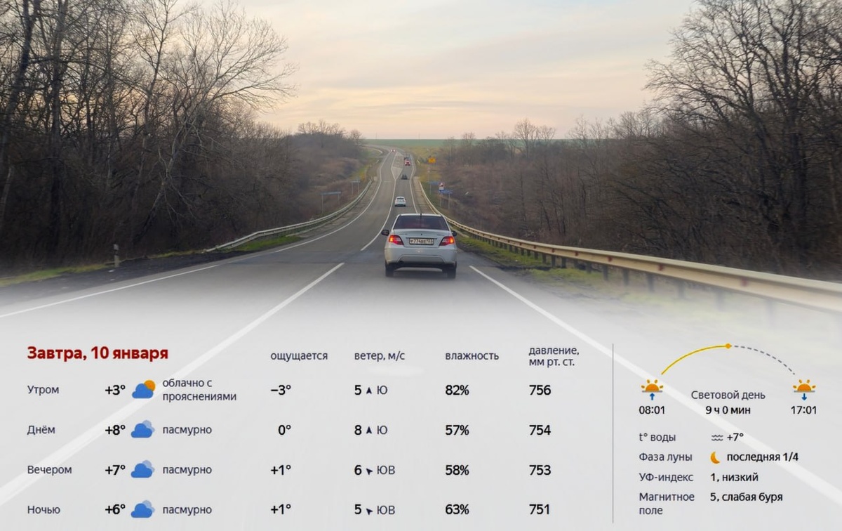 Завтра, 10 января, в Краснодаре ожидается прохладная и ветреная погода. Утром около +3°, из-за ветра будет ощущаться холоднее. Днём температура повысится до +8°, но сохранится пасмурная и некомфортная погода. Вечером около +7°, ночью до +6°, без осадков, но с высокой влажностью. Световой день продлится 9 часов, восход в 08:01, закат в 17:01. Температура воды +7°, УФ-индекс низкий, магнитное поле - слабая буря. Подробнее: https://краснодарскийкрай.рф/news/prognoz-pogody-v-krasnodare-na-10-janvarja-2026-goda.html Прогноз погоды на неделю: https://краснодарскийкрай.рф/pages/weather-forecast.html #погода #прогнозпогоды #температура #осадки #ветер #климат #метеопрогноз #метеосводка #краснодар #краснодарскийкрай #krasnodarregion